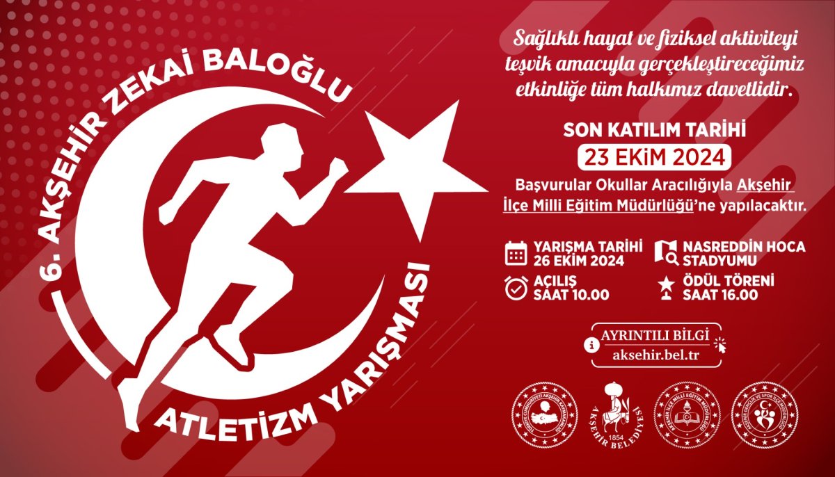 Akşehir Kaymakamlığı, Akşehir Belediyesi, Akşehir Gençlik ve Spor İlçe Müdürlüğü ve Akşehir İlçe Milli Eğitim Müdürlüğü iş birliği ile Zekai Baloğlu Atletizm Yarışması’nın 6’ncısı düzenleniyor. Sağlıklı hayat ve fiziksel aktiviteyi teşvik amacıyla gerçekleştirilen yarışma 26 Ekim 2024 Cumartesi günü, saat 10.00’da Nasreddin Hoca Stadyumu’nda gerçekleştirilecek. Yarışmanın ödül töreni ise saat 16:00’de düzenlenecek.