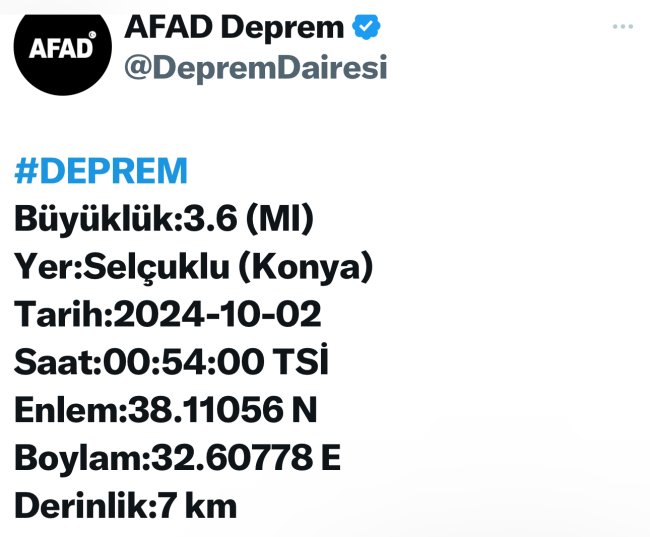 AFAD duyurdu: Konya'da deprem oldu Konya'da 3,6 büyüklüğünde deprem meydana geldi. AFAD, depremin detaylarına ilişkin açıklama yaptı. Editor: SÜLEYMAN BADEMCİ 02 Ekim 2024 - 01:21 Artçı depremlerin ardı arkası kesilmiyor. AFAD'ta alınan ilgiye göre, Konya'da 3,6 büyüklüğünde deprem oldu. Merkez üssü Selçuklu olduğu aktarıldı.Saat 00.54 sularında meydana gelen depremin derinliği de 7 kilometre olarak kaydedildi. Paylaş Tweetle WhatsApp YORUMLAR 0 Yorum adlı kullanıcıya cevap Kabinede Kritik Değişiklik! Adalet ve İçişleri Bakanları Değişti Hakkâri'den Acı Haber: Bir asker şehit oldu Emniyet'te yeni atama kararları açıklandı: 5 ismin görev yeri değişti BÜYÜK İKRAMİYE AKŞEHİR'E ÇIKTI İstasyon Haber Gazetesinden Ayhan Kelekçi’ye ziyaret Jandarma ekiplerinden 779 öğrenciye trafik eğitimi
