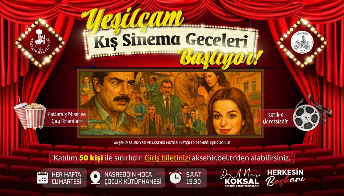 Akşehir Belediyesi, kültür ve sanat etkinlikleri kapsamında kış aylarına özel anlamlı bir projeyi daha hayata geçiriyor. Akşehir Belediyesi ve Akşehir Motosikletçiler Derneği iş birliğinde düzenlenen ‘Yeşilçam Kış Sinema Geceleri’, Türk Sinemasının hafızalara kazınan yapımlarını Akşehirli sinemaseverlerle buluşturacak.