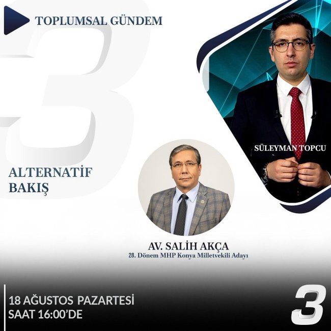 Bölgemizin tanınmış hukukçularından Av.Salih Akça ve gazetemizin yazarlarından Av.Can Kamalı, 18 Ağustos Pazartesi günü Kanal 3 ekranlarında yayınlanan Alternatif Bakış programına konuk olacak.