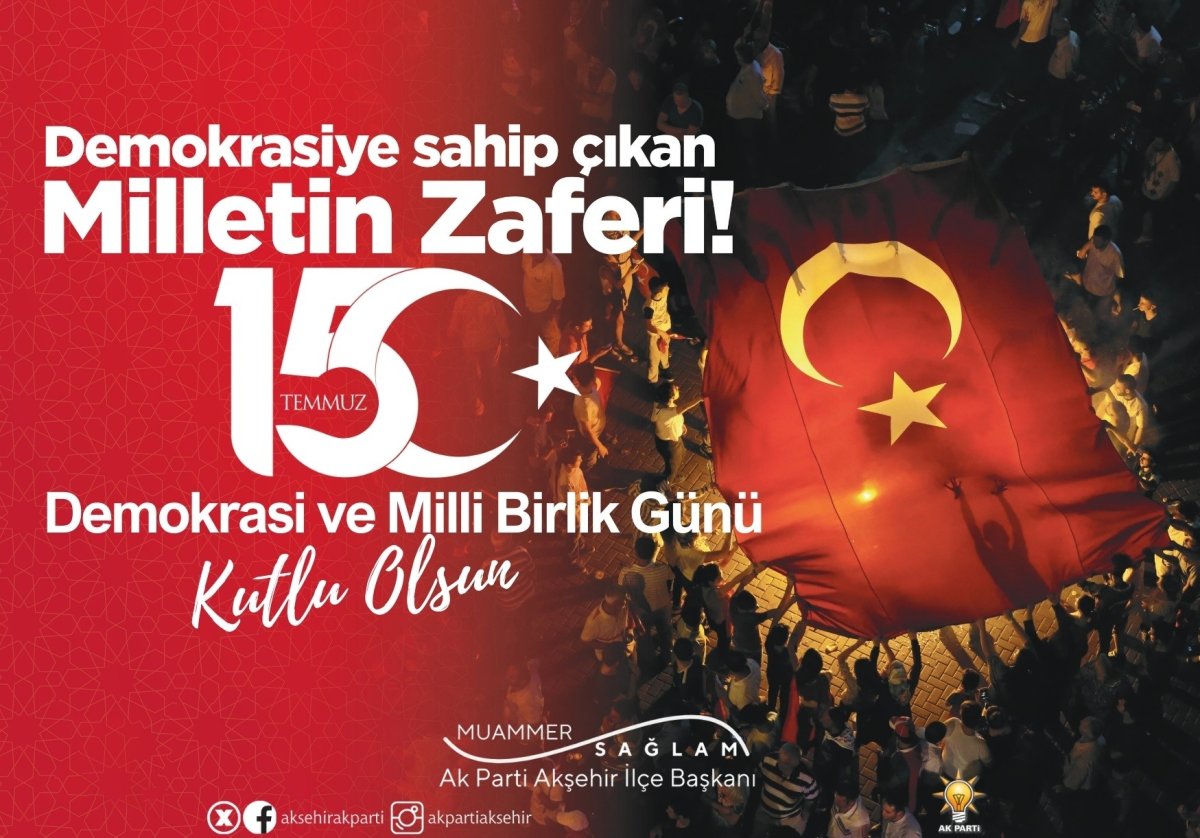 Ak Parti Akşehir İlçe Başkanı Muammer Sağlam, 15 Temmuz Demokrasi ve Milli Birlik Günü münasebetiyle mesaj yayımladı.