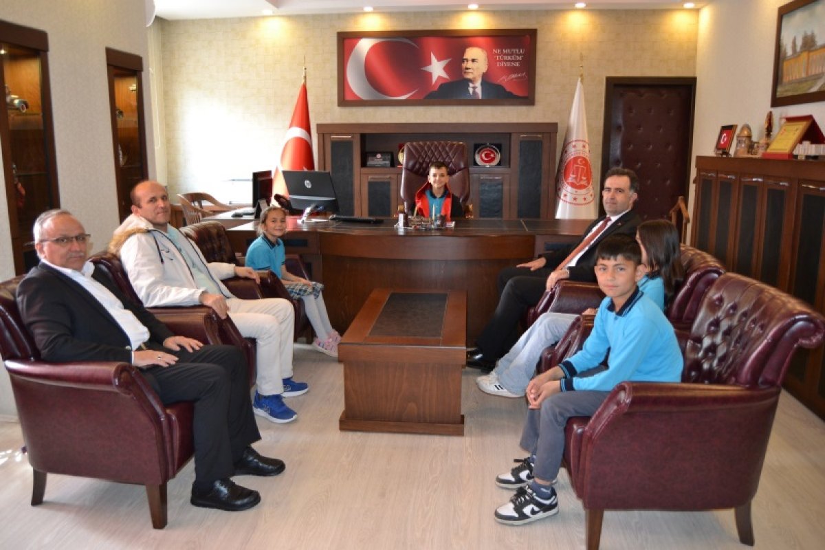 Okul Müdürü Ramazan Gümüş, Sınıf Öğretmeni Metin Şahin ile öğrenciler Miraç Durmaz, Şahin Akkaş, Emine Özkan ve Öykü Katar’ın katıldığı ziyarette, bayram coşkusu adliyeye taşındı.Ziyaret sırasında Cumhuriyet Başsavcısı Mustafa Abur, temsili olarak makamını öğrenci Miraç Durmaz’a devretti ve kendisine cübbe giydirdi. Renkli anlara sahne olan programda, öğrencilere çeşitli hediyeler de takdim edildi.Hatıra fotoğrafı çekiminin ardından öğrenciler, unutulmaz bir deneyim yaşayarak adliyeden ayrıldı.
