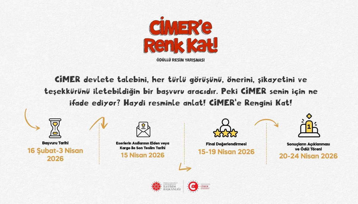 “CİMER’e Renk Kat” Ödüllü Resim Yarışması'na başvurular 16 Şubat’ta alınmaya başlandı. İlkokul ve ortaokul öğrencileri son başvuru tarihi olan 3 Nisan 2026’ya kadar çizdikleri resimleri JPG, PNG ve PDF formatında yükleyerek başvurularını tamamlayabilecekler. Pastel boya, sulu boya, guaj boya, gazlı kalem, kara kalem ya da serbest teknikte, en az A4 boyutlarındaki bir kağıda çizilmesi istenen resimlerin asıllarının elden veya kargo ile teslimi için ise son tarih 15 Nisan 2026 olarak belirlendi. 15-19 Nisan 2026’da yapılacak final değerlendirmeleri ardından sonuçlar 20-24 Nisan tarihlerinde açıklanacak. Birinci, ikinci ve üçüncü seçilen resimlerin sahiplerine, düzenlenecek ödül töreninde, sürpriz ödüller verilecek.