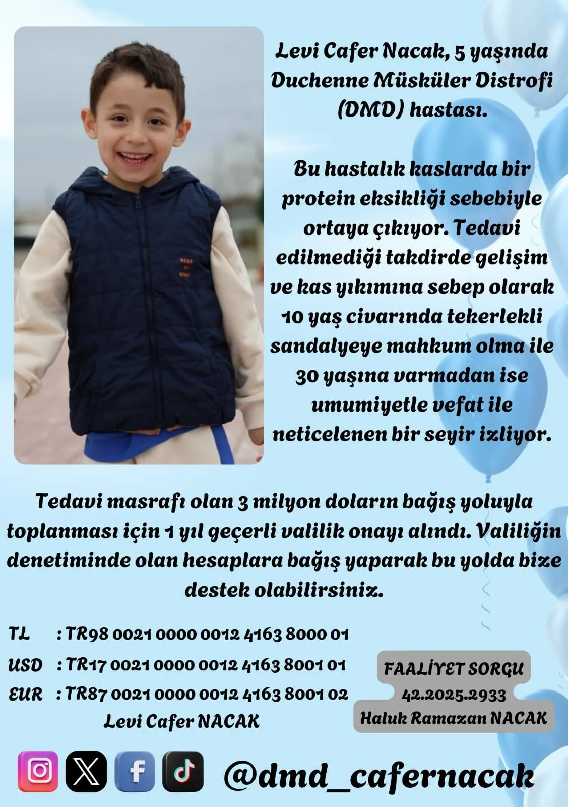 4-5 yaş civarında ayak parmak ucunda yürüme gibi belirtilerle başlıyor, önce bacak, ardından kol kaslarında güçsüzlük meydana geliyor. 10’lu yaşların ortalarında da diyafram kası etkilenerek nefes almakta güçlük meydana geliyor. 20’li yaşlara gelindiğinde ise solunum cihazı zorunlu hale geliyor. Hatta 10 yaşından itibaren tekerlekli sandalyeye mahkum olunma ihtimali var. 20’li yaşın ortalarından itibaren de kalp kaslarının zayıflamasıyla maalesef genelde ölüm meydana geliyor. DMD hastalığının bu zamana kadar bilinen tek tedavisi kortizonla biraz geciktirme var. 2024’ün Temmuz ayında ise Amerika’da bir firma tarafından gen tedavisi geliştirilmiş. Bu tedavinin uygulama yerlerinden bir tanesi de Dubai. Oğlumun burada tedavi görmesi için başvuru yaptık. Şu anda da Valilik onaylı kampanyamızla bir an önce evladımın tedavisine kavuşması adına sürecimiz devam ediyor. DMD hastalığında zaman çok kıymetli. Oğlumun daha fazla zaman kaybetmesini değil, tez zamanda sağlığına kavuşmasını istiyoruz” diye anlattı.