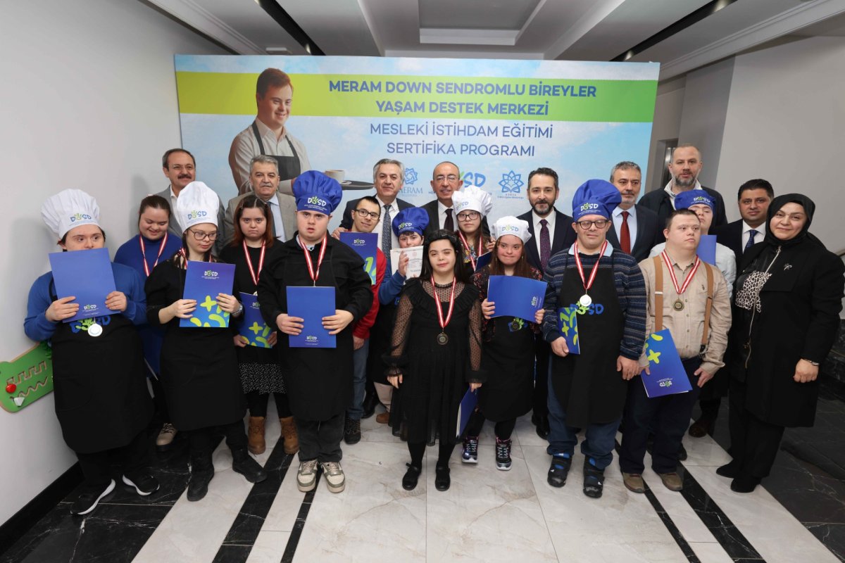 Meram Belediyesi öncülüğünde hayata geçirilen Down Sendromlu Bireyler Yaşam Destek Merkezi DOSD Meram, bir büyük gurur daha yaşadı. Down sendromlu gençleri iş hayatına kazandırmak amacıyla Meram Halk Eğitim Merkezi iş birliğiyle yürütülen Servis Personeli (Komi) Eğitimi’nin ilk dönem mezunları sertifikalarını aldı. Konya Büyükşehir Belediyesi Başkan Vekili Mustafa Uzbaş, Meram Belediye Başkanı Mustafa Kavuş, Konya İl Milli Eğitim Müdürü Murat Yiğit, Meram İlçe Milli Eğitim Müdürü Mustafa Koca, DOSD Meram Dernek Başkanı Mehmet Munlafalıoğlu, Meram Halk Eğitim Merkezi Müdürü Cavit Arıtürk’ün katıldığı törende, aylar süren emek, sabır ve azmin karşılığı olan sertifikalar, özel bireylere gururla takdim edildi.