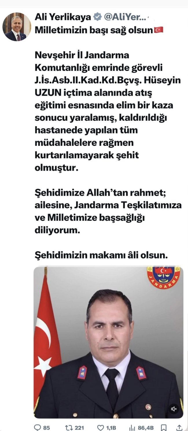"Milletimizin başı sağ olsun. Nevşehir İl Jandarma Komutanlığı emrinde görevli Astsubay Kıdemli Başçavuş Hüseyin Uzun, içtima alanında atış eğitimi esnasında elim bir kaza sonucu yaralanmış, kaldırıldığı hastanede yapılan tüm müdahalelere rağmen kurtarılamayarak şehit olmuştur.