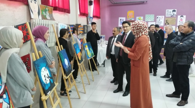Okul binasında açılan ve Kaymakam, protokol mensupları ve davetlilerin katıldığı sergide, çeşitli tekniklerde çalışılmış bir birinden güzel 70 eser yer aldı.