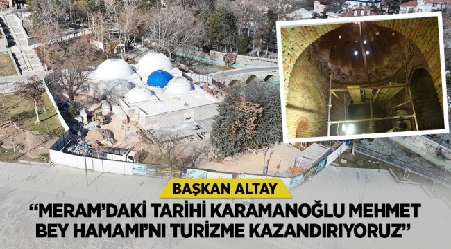 Tarihi Meram Köprüsü yanında restorasyonunu yürüttükleri 15. yüzyıla ait Karamanoğlu Mehmet Bey Hamamı’nın da Konya’nın önemli tarihi miraslarından birisi olduğunu kaydeden Başkan Altay, “Kadim şehrimizin tarihi ve kültürel mirasını koruyarak geleceğe taşımak için önemli çalışmalar yürütüyoruz. Bu kapsamda, Tarihi Meram Köprüsü’nün hemen yanında yer alan Konyalıların Meram Hamamı olarak bildiği Karamanoğlu Mehmet Bey Hamamı’nda başlattığımız restorasyon çalışması aralıksız devam ediyor. Konya’nın önemli tarihî yapılarından biri olma özelliği taşıyan bu kıymetli eser, aslına uygun bir şekilde restore edilerek tekrar hayat bulacak. Titizlikle yürüttüğümüz çalışmalar sayesinde hem yapının özgün kimliği korunacak hem de kültür ve turizm açısından şehre değer katacak bir mekân ortaya çıkacak. Şu an itibariyle yaklaşık yüzde 70 tamamlanma oranını ulaşmış durumdayız. Hem Meram ilçemize hem şehrimize değer katacak restorasyon projesini yıl içerisinde tamamlayarak Konya turizmine kazandırmayı arzu ediyoruz” ifadelerini kullandı.