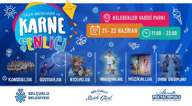 Selçuklu Belediyesi, karne sevinci yaşayan öğrenciler için eğlence dolu bir “Yaza Merhaba ve Karne Şenliği” organize ediyor. Kelebekler Vadisi Parkı’nda gerçekleştirilecek olan şenlik, 21-22 Haziran 2025 tarihlerinde, Cumartesi ve Pazar günleri saat 11.00 ile 23.00 arasında yapılacak. Yoğun ve verimli geçen bir eğitim döneminin ardından düzenlenen bu etkinlik ile öğrenciler hem yılın yorgunluğunu atacak hem de aileleriyle birlikte keyifli vakit geçirme imkânı bulacak. İki gün sürecek şenlikte çeşitli eğlence alanları, sahne gösterileri, müzik etkinlikleri ve çocuklara özel aktiviteler yer alacak.