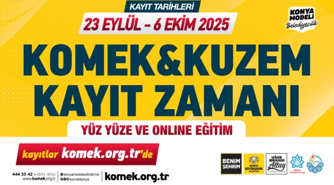 Konya merkez ve ilçelerdeki KOMEK ve ASEM merkezlerinde 6 Ekim’e kadar eğitim kayıtları alınacak. Spor ve yüzme gibi ücretli kurslar için kayıtlar ise 25 Eylül 2025 Perşembe günü saat 08.00’de başlayacak.
