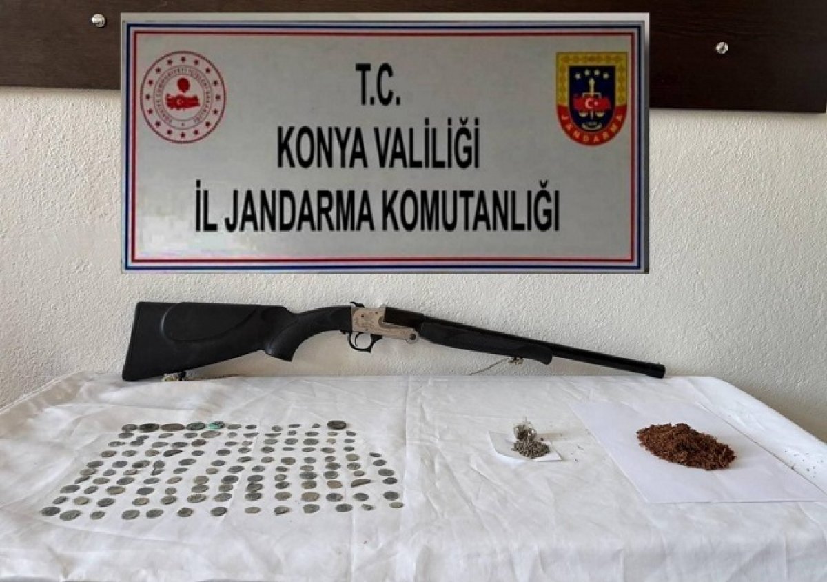 Konya’da jandarma ekiplerince Çumra ilçesinde gerçekleştirilen operasyonda bir şahsın evinde yapılan aramalarda uyuşturucu madde, tarihi eser ve ruhsatsız silah ele geçirildi.