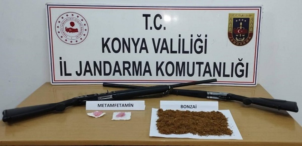 Ekiplerin yaptığı aramada, 180 gram bonzai, 2 gram metamfetamin, 2 adet ruhsatsız av tüfeği ve 3 adet tüfek kartuşu ele geçirildi.