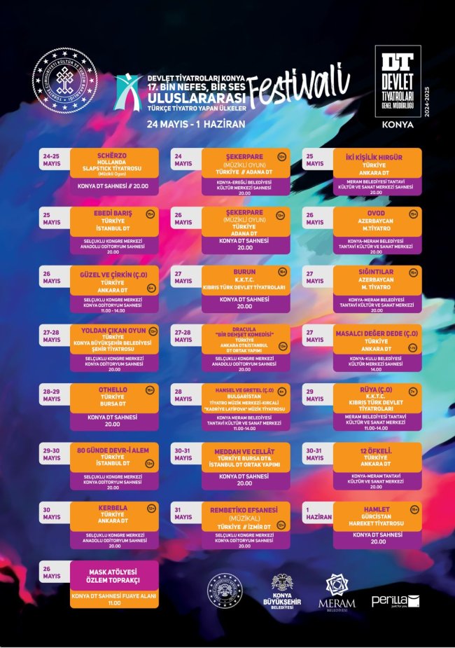 Kültür ve Turizm Bakanlığı, Devlet Tiyatroları Genel Müdürlüğü, Konya Valiliği, Konya Büyükşehir Belediye Başkanlığı ve Meram Belediye Başkanlığı işbirliğinde, Konya’da bu yıl 17’ncisi düzenlenecek olan ‘Konya Bin Nefes Bir Ses Uluslararası Türkçe Tiyatro Yapan Ülkeler Festivali’, 24 Mayıs-1 Haziran tarihleri arasında gerçekleştirilecek.