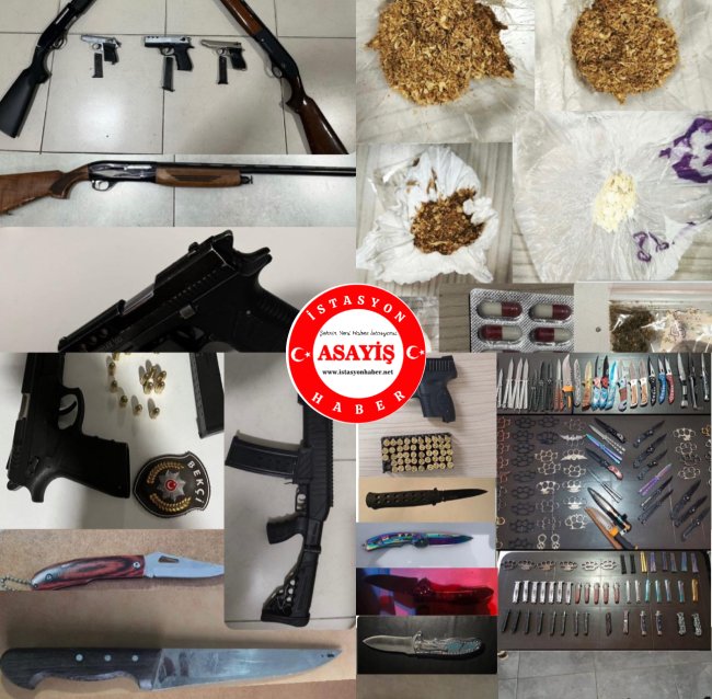 Denetimlerde 15 ruhsatsız tabanca, 18 kurusıkı tabanca, 17 ruhsatsız av tüfeği, 455 kesici-delici alet, 175 adet fişek, 1.056 adet uyuşturucu hap, 46.45 gram metamfetamin, 464.38 gram bonzai, 20 gram esrar, 12.49 gram ADB-Butinica, 1.17 gram eroin ve 551 paket kaçak sigara ele geçirildi.