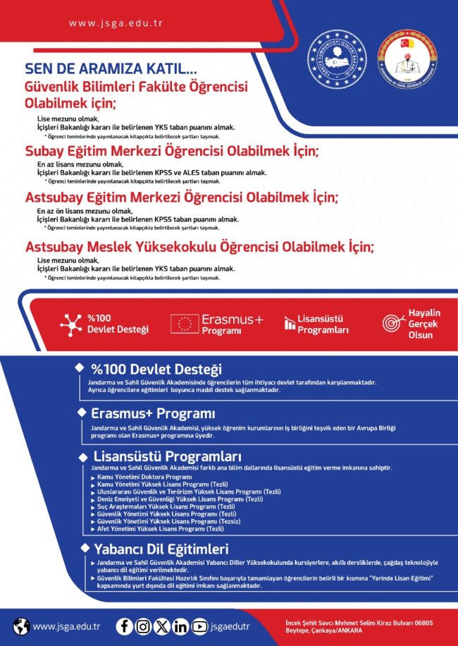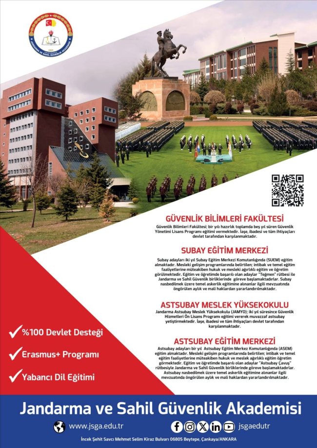 Jandarma Genel Komutanlığı ve Sahil Güvenlik Komutanlığının görev ihtiyaçlarına cevap verecek en uygun nicelik ve nitelikte insan kaynağının oluşturulması maksadıyla; Jandarma ve Sahil Güvenlik Akademisi Başkanlığına (JSGA) her yıl “Personel Temin ve Yetiştirme Planı” doğrultusunda belirlenen kontenjan kadar subay astsubay adayı öğrenci temini yapmakta.