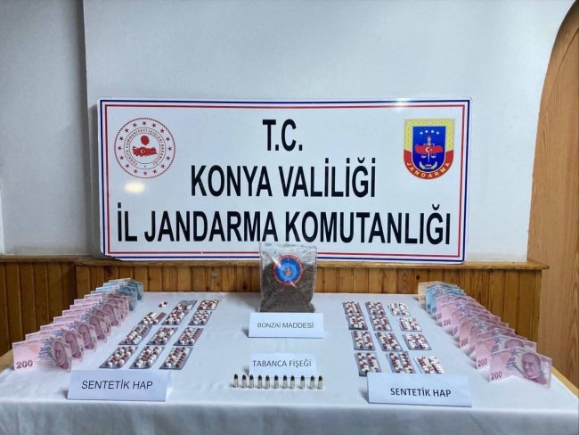 Konya İl Jandarma Komutanlığı ekiplerince Ereğli ve Çumra ilçelerinde düzenledikleri operasyonlarda uyuşturucu madde, silah ve para ele geçirildi.