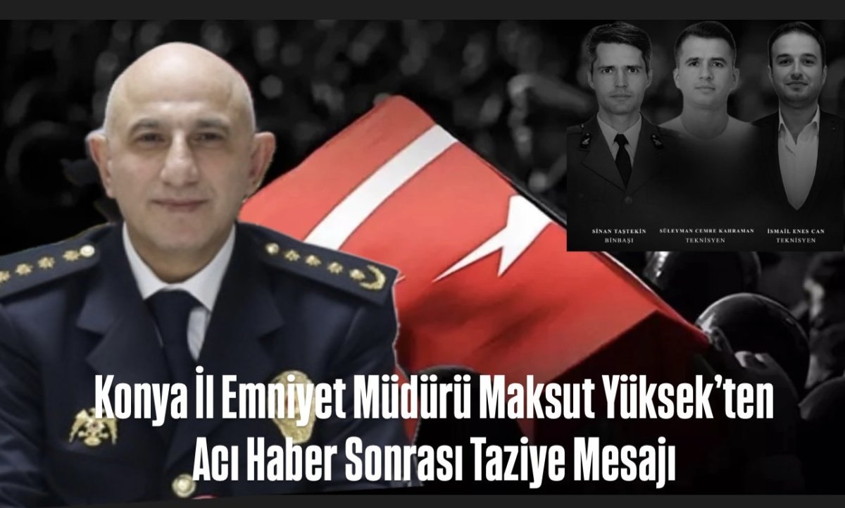 Konya İl Emniyet Müdürü Maksut Yüksek, yayımladığı resmi mesajla şehitlerin ailelerine ve Türk milletine başsağlığı dileklerini iletti. Yüksek, mesajında şu ifadelere yer verdi: