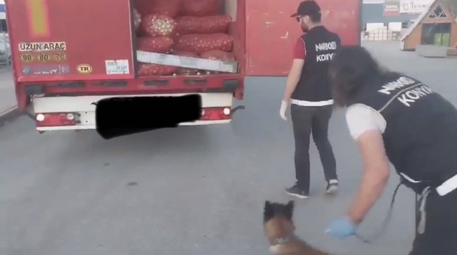 Soğan yüklü kamyonda narkotik ekiplerinin hassas burunlu narkotik köpeği eşliğinde yaptığı aramada, soğan çuvallarının arasına gizlenmiş vaziyette, 323 parça halinde 177 kilogram Skunk Maddesi ele geçirildi.