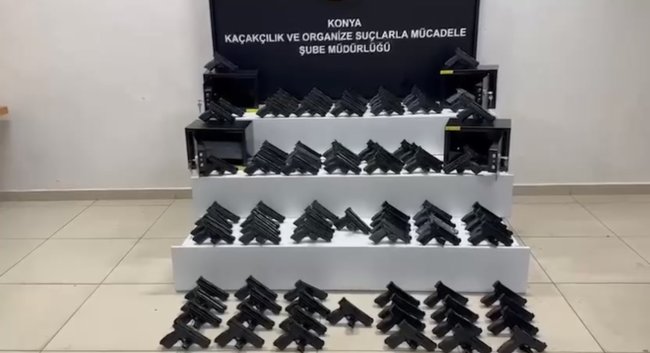 Konya’da polis ekiplerinin düzenlediği operasyonda, kargo gönderisi içerisindeki çelik kasalara gizlenmiş 100 ruhsatsız tabanca ele geçirildi.