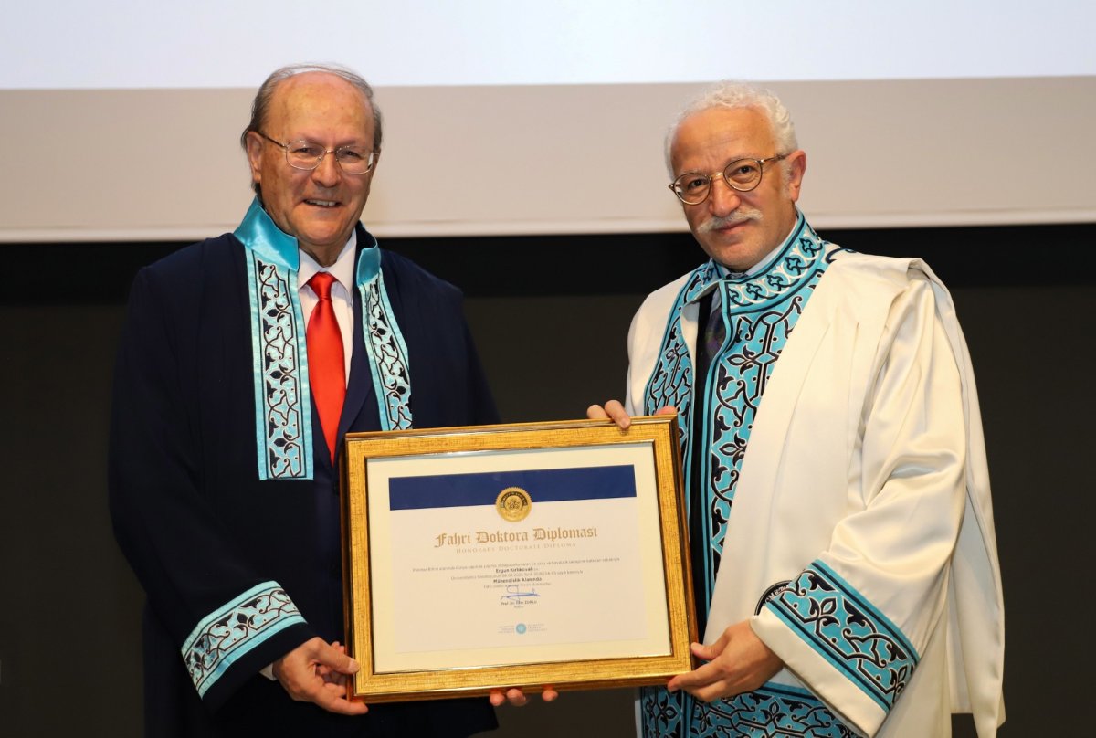 Söyleşinin ardından NEÜ Rektörü Prof. Dr. Cem Zorlu, iş insanı Ergün Kırlıkovalı’ya hediye ve fahri doktora payesini takdim etti.
