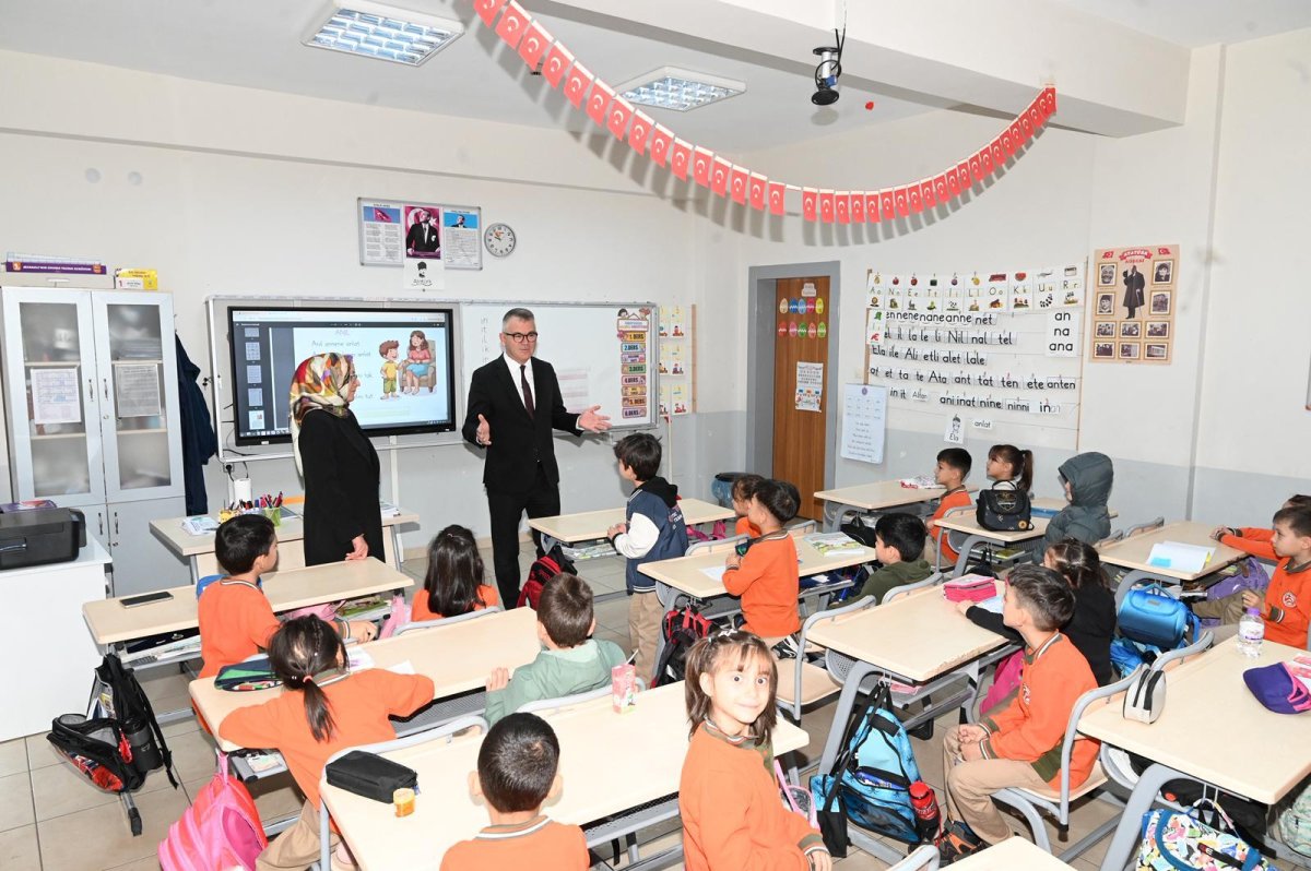 Başkan Ustaoğlu, daha sonra öğretmenler odasına gelen öğrencilerle birlikte öğretmenler gününü kutlarken, sınıflara giderek öğrencilerle birlikte ders dinledi.