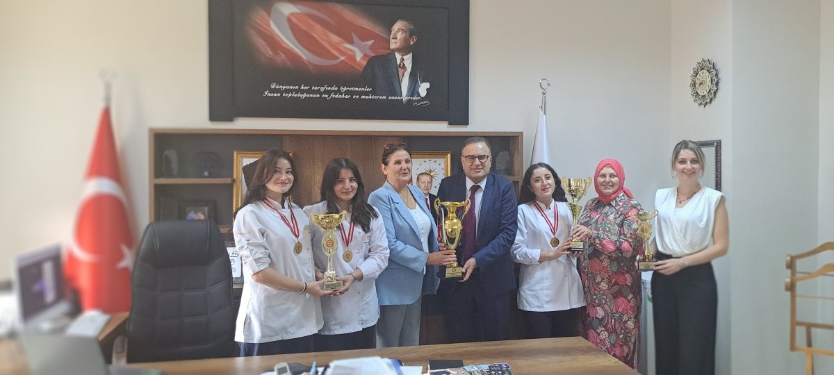 Milli Eğitim Bakanlığı tarafından Kırşehir' de düzenlenen Ahilik Aşçılık Yarışmasında Türkiye birincisi olan Şehit Özden Çınar Kız MTAL idareci, öğretmen ve öğrencileri İlçe Milli Eğitim Müdürümüz Barbaros Topaloğlu’nu ziyaret etti.