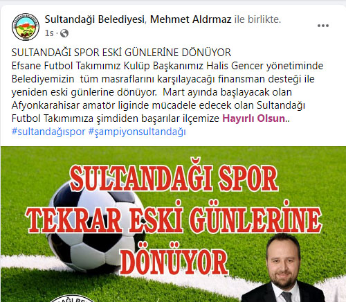 Konuya ilişkin sosyal medya hesabından açıklama yapan Başkan Aldırmaz, "Efsane Futbol Takımımız Kulüp Başkanımız Halis Gencer yönetiminde Belediyemizin tüm masraflarını karşılayacağı finansman desteği ile yeniden eski günlerine dönüyor. Mart ayında başlayacak olan Afyonkarahisar amatör liginde mücadele edecek olan Sultandağı Futbol Takımımıza şimdiden başarılar ilçemize hayırlı olsun" ifadelerini kullandı.