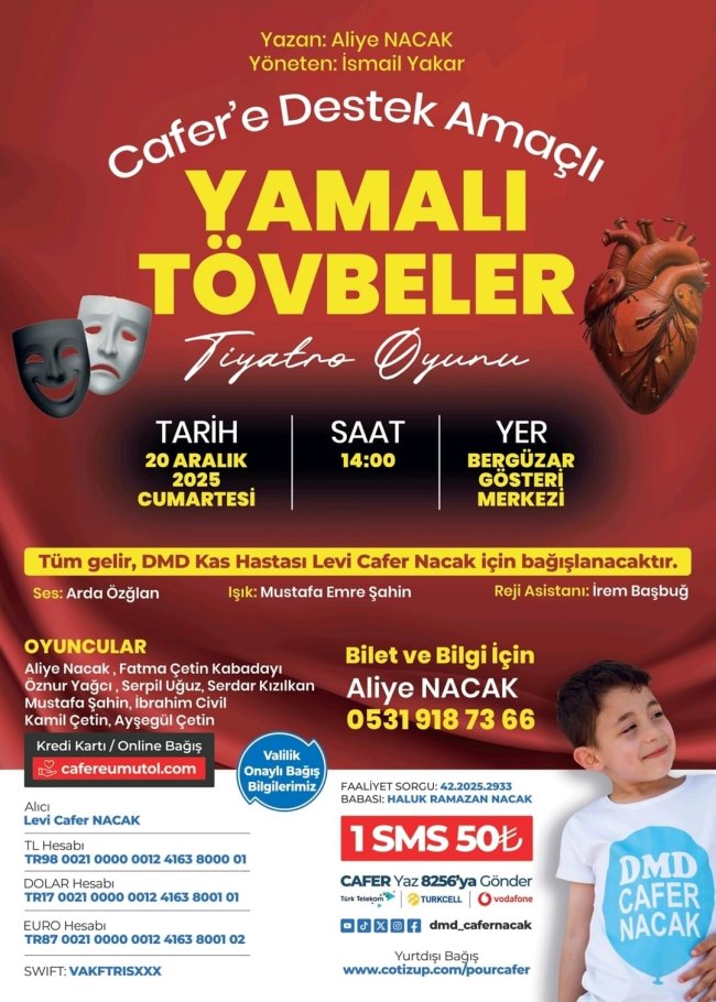 Yönetmenliğini İsmail YAKAR’ın, Reji Asistanlığını İrem BAŞBUĞ’un yaptığı Aliye NACAK’a ait Tiyatro oyunu 20 Aralık Cumartesi günü bu kez DMD hastası Cafer Nacak için izleyicisi ile buluşacak.