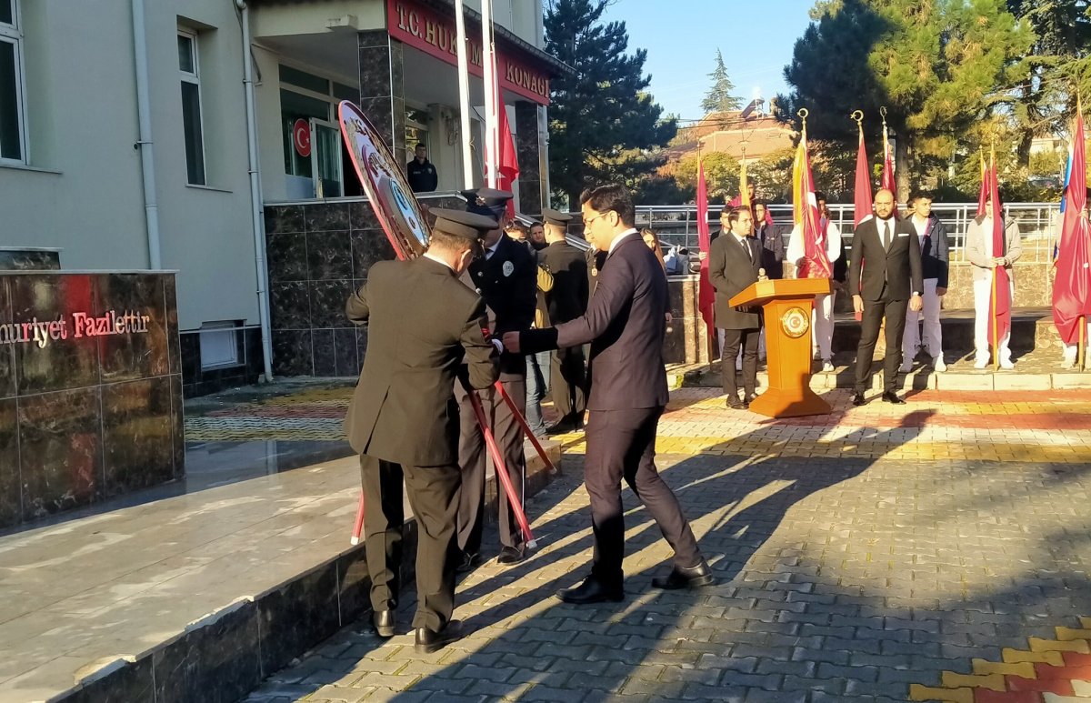 Çelenk sunma töreninde; Kaymakamlık Makamı ve Belediye Başkanlığı çelenklerini Atatürk Anıtına sunulmasıyla başlandı. Ulu Önder Mustafa Kemal Atatürk'ün ebediyete intikal saati olan 09:05’te ilçe genelinde çalınan sirenler eşliğinde iki dakikalık saygı duruşu ve akabinde İstiklal Marşı okunması ile bayraklar yarıya indirildi.