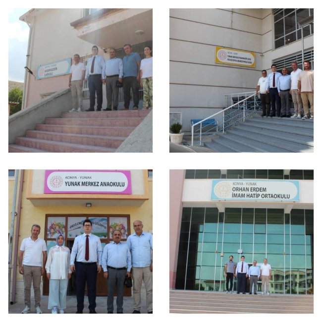 Kaymakam Atasoy ve İlçe Müdürü İşcan ziyaretleri kapsamında; Merkez Anaokulu, İnönü Ortaokulu, Atatürk İlkokulu, Halk Eğitimi Merkezi, Akşemsettin İlkokulu, Yunak Anadolu İmam Hatip Lisesi, Orhan Erdem İmam Hatip Ortaokulu, Hacı Tekin İlkokulu, Cemal Karacan Anadolu Lisesi ve Şehit Şevki Akgün Mesleki ve Teknik Anadolu Lisesini gezerek yeni öğretim yılı için yapılan hazırlık çalışmaları hakkında, okul yöneticilerinden bilgi aldılar.